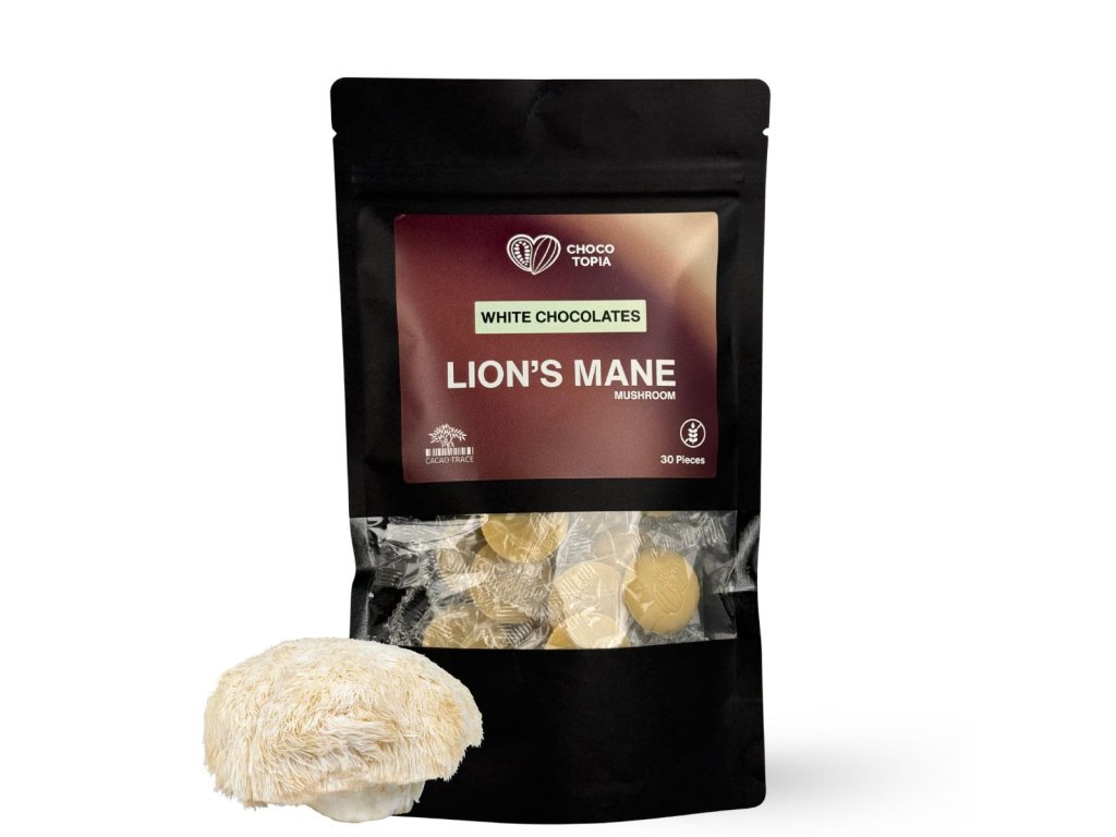 Bílá čokoláda s Lion’s Mane (Lví hříva) ve formě 30 individuálně zabalených pecek.
