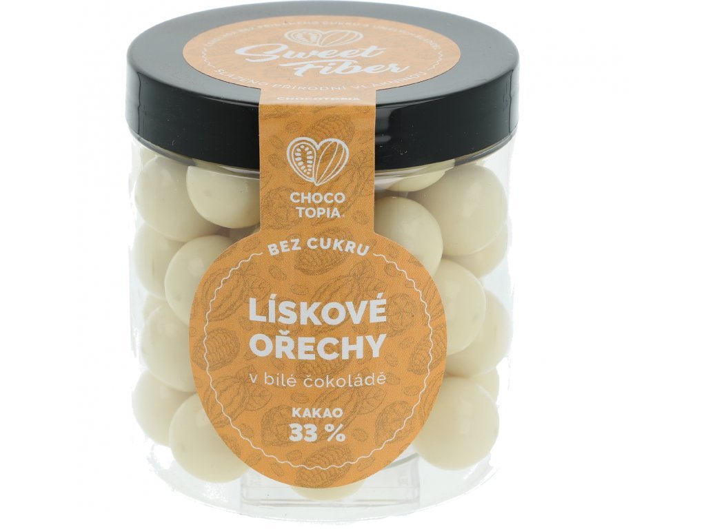 160g lískové ořechy v bílé čokoládě 33% slazené přírodní vlákninou bez přidaného cukru