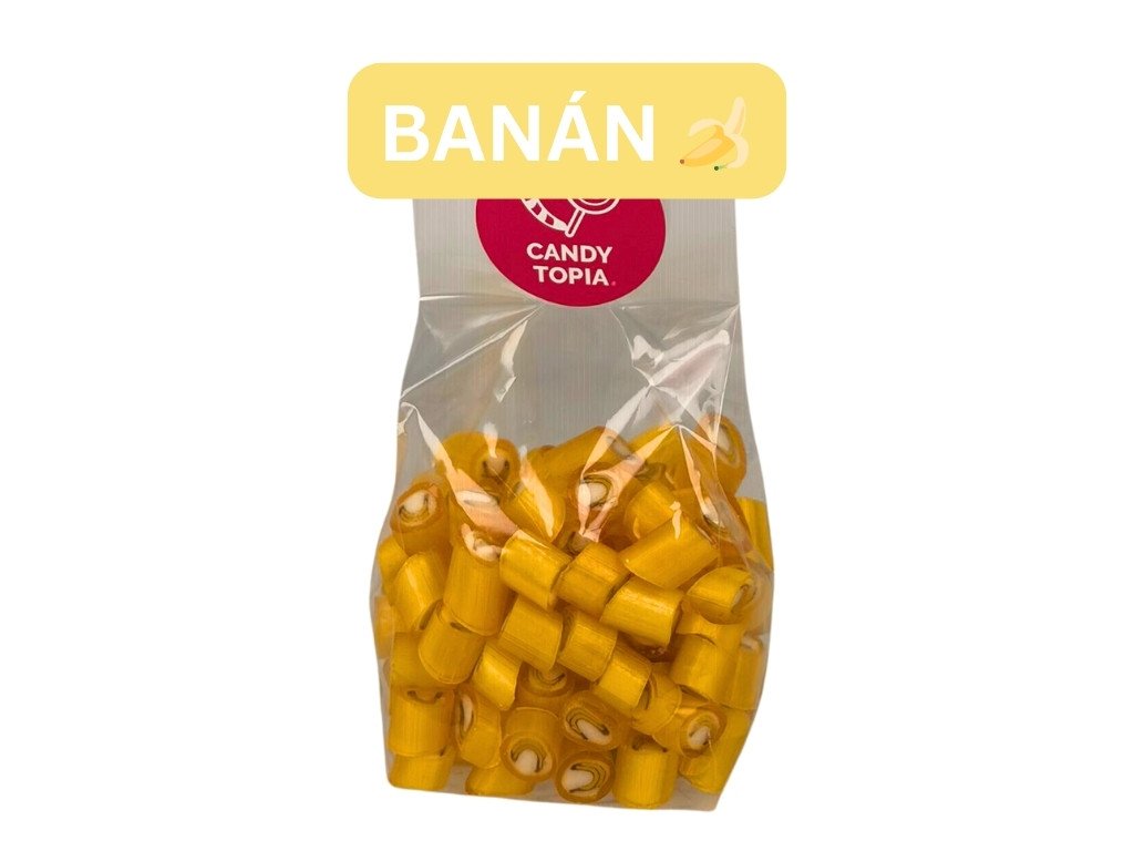 Složení: cukr, glukóza, voda, kyselina citrónová, barviva [(E102, E110 - mohou nepříznivě ovlivňovat činnost a pozornost dětí), E133], bananová aromata. Může obsahovat stopy orechů.