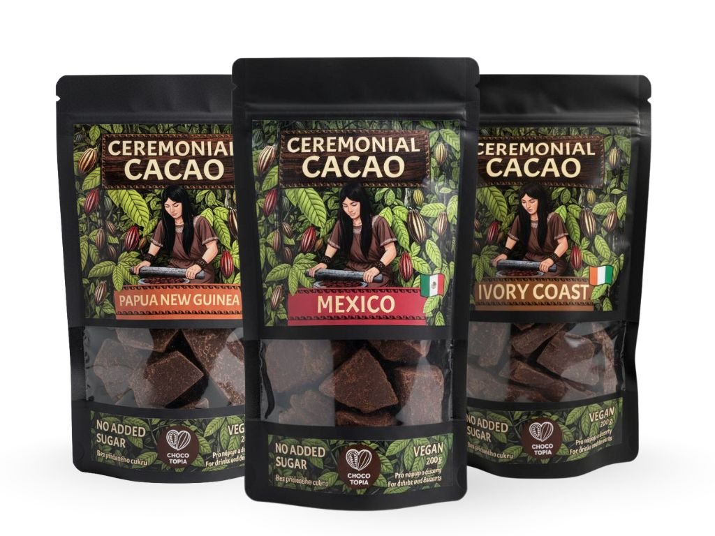 Zažijte ceremoniální kakao v jeho nejčistší podobě. Tento exkluzivní rituální balíček obsahuje tři prémiové druhy kakaa, vyrobené ze 100% čisté kakaové hmoty, veganské a bez cukru. Perfektní jako přírodní náhrada kávy, ideální pro ceremonie, meditaci a vědomé okamžiky.